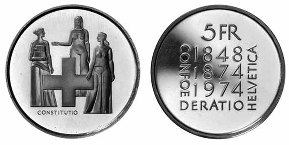 Oben Wertangabe 5 Fr mit den Jahren der Verfassungsrevisionen. Um diese Jahreszahlen steht CONFOEDERATIO HELVETICA