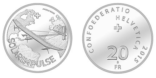 Umschrift unten SOLARIMPULSE im Hintergrund die Welt oben Schwiezerkreuz und oben rechts Künstlename in der mit Das Flugzeug Solarimpulse abgebildet das die Welt umrundet.