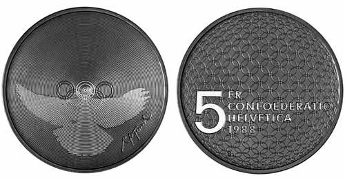 Rückseite:Die Wertseite besteht aus vielen ineinander greifenden Kreisen analog den olympischen Ringen. Negativ steht eine grosse 5 geschrieben und von oben nach unten FR / CONFOEDERATIO / HELVETIA / 1988